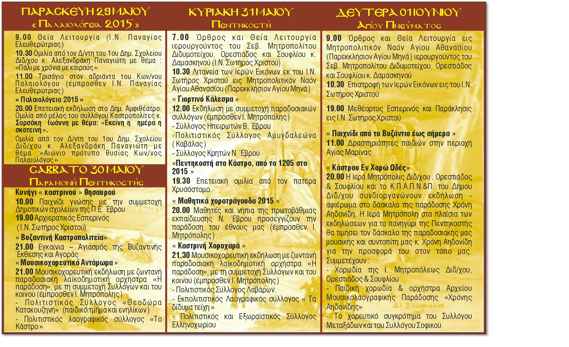 Καλούμε όλους τους συντοπίτες μας και τους επισκέπτες του Διδυμοτείχου να παρευρεθούν στο Κάστρο του Διδυμοτείχου και να γιορτάσουμε το « Καλέ Πανηγύρι » και να αποδείξουμε ότι ιστορική μνήμη μας είναι αναλλοίωτηστο πέρασμα των αιώνων και η απόδοση τιμών στους προγόνους μας , καθήκον .