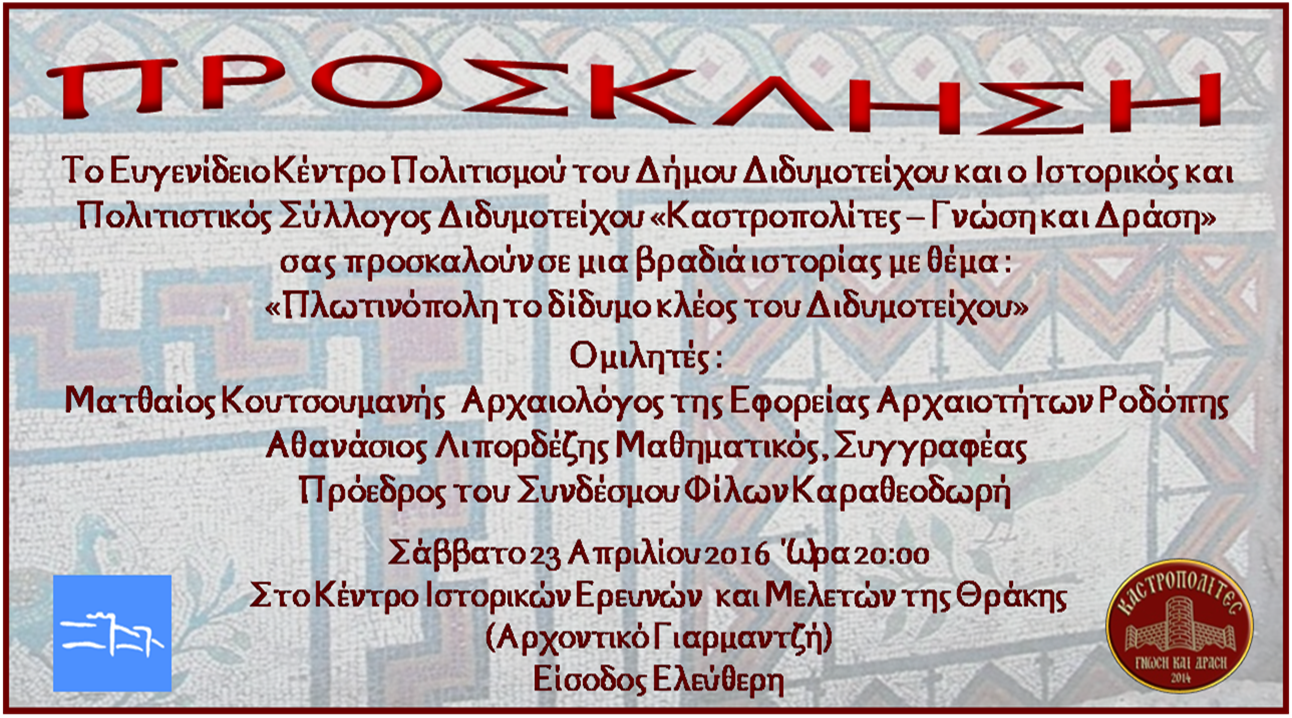 Πρόσκληση σε μια βραδιά ιστορίας με θέμα "Πλωτινόπολη το δίδυμο κλέος του Διδυμοτείχου"