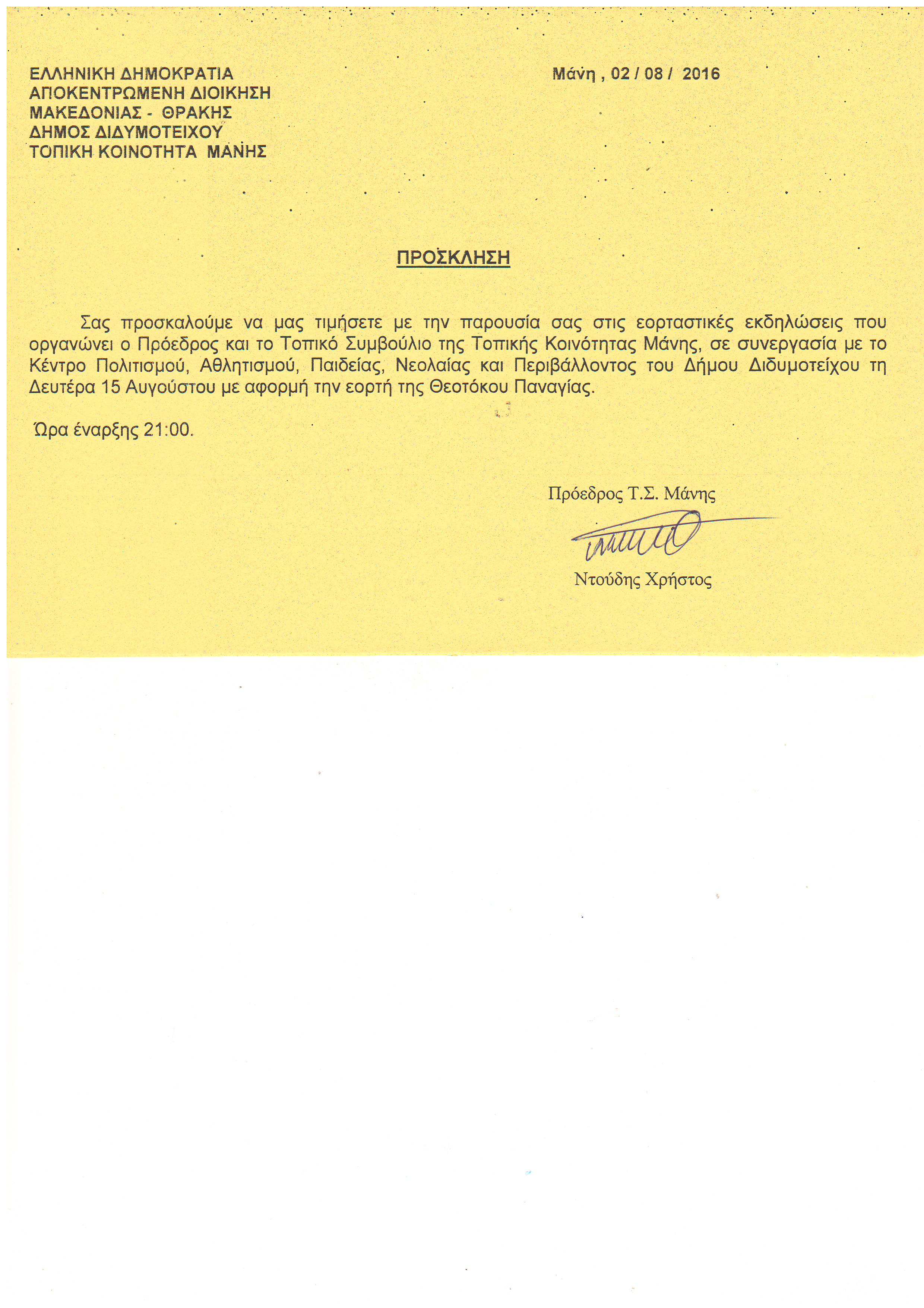 Πρόσκληση στις γιορταστικές εκδηλώσεις.