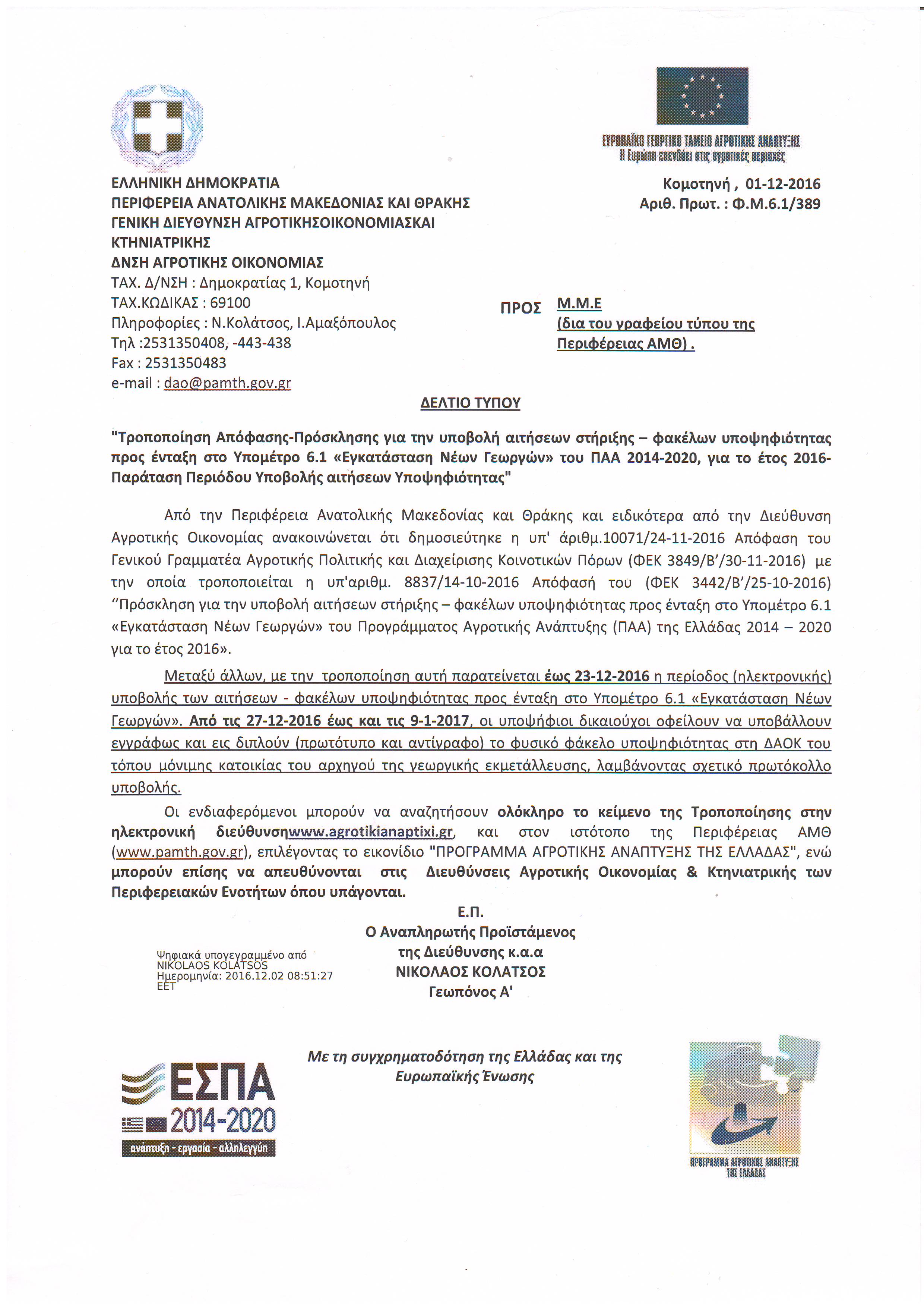 ΑΝΑΚΟΙΝΩΣΗ ΝΕΟΙ ΑΓΡΟΤΕΣ