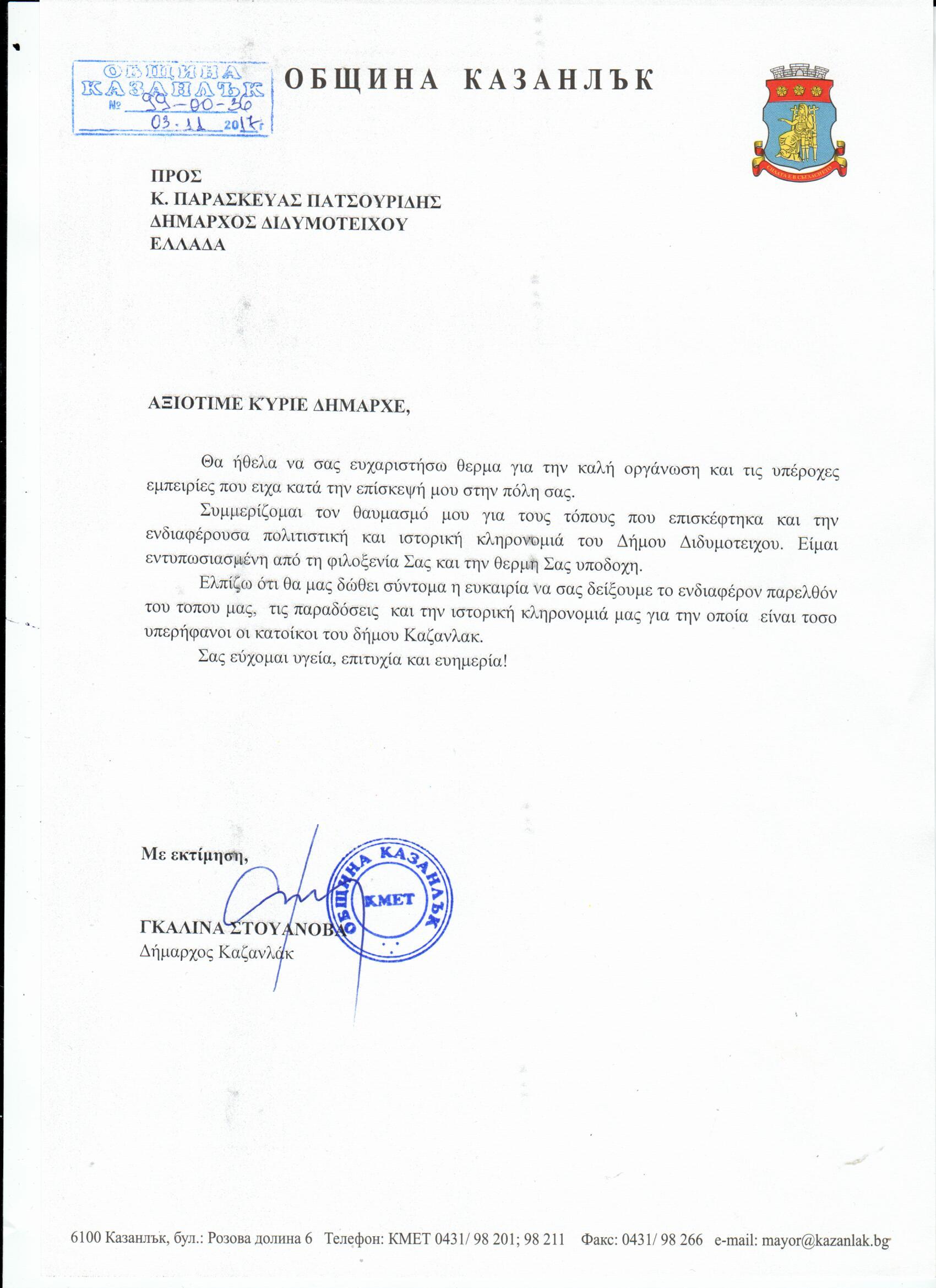 Ευχαριστήρια επιστολή προς τον Δήμαρχο Διδυμοτείχου Παρασκευά Πατσουρίδη από τη Δήμαρχο Καζανλάκ Γκαλίνα Στουάνοβα